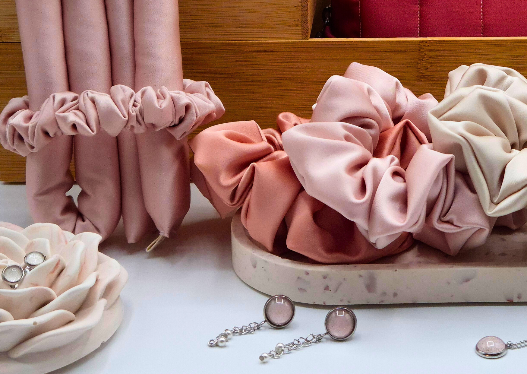 Les chouchous sont faits main, en satin duchesse, pour s’adapter parfaitement à tous les types de cheveux.